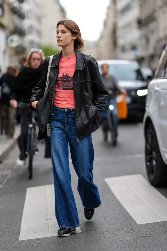 - Street-smart day look: wide-leg jeans + fitted top + oversized neutral-toned jacket. Finish with sneakers or ankle boots.